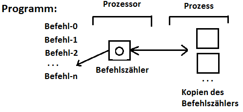 Der Weg durch ein Programm, den ein Thread zurücklegt, wird durch einen Befehlszähler (Program Counter) gesteuert. Dieser Befehlszähler ist ein spezielles Register des jeweiligen Prozessors. Es enthält die Hauptspeicheradresse des Befehls, der als nächster auszuführen ist. Anschaulich zeigt das Register auf diesen Befehl. Wird ein Prozess durch ein Time Sharing unterbrochen, dann wird unter anderem in einer zum Prozess gehörenden Variablen eine Kopie des aktuellen Stands des Befehlszählers, also eine Art Wegmarkierung, abgelegt. Wird dem Prozess zu einem späteren Zeitpunkt wieder Rechenzeit zugeteilt, dann wird diese Kopie des Befehlszählers auf den Befehlszähler zurückgeschrieben. Der Prozess, genauer gesagt, der unterbrochene Thread, wird dadurch an der Unterbrechungsstelle fortgesetzt. Das folgende Bild veranschaulicht diesen Sachverhalt: