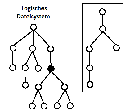 Anwendungsprogramme können jetzt auf die Dateien des logischen Dateisystems zugreifen, auf die der beiden physikalischen immer noch nicht. In einem zweiten Schritt wird ein leeres Verzeichnis des logischen Dateisystems, es soll das in der Grafik schwarz markierte sein, mit der Wurzel eines weiteren physikalischen Dateisystems identifiziert, wodurch dieses anschaulich in das logische Dateisystem eingebunden wird. Im Beispiel wird von links nach rechts verfahren.