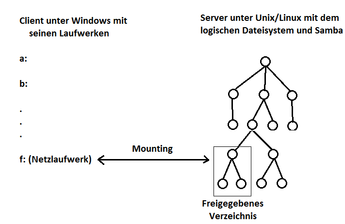 NFS steht auch auf Windows-Servern zur Verfügung, wodurch Unix/Linux-Systeme Zugang zu deren Dateien erhalten können, allerdings wird in gemischten Umgebungen meist SMB auf der Seite von Windows und die Samba-Software auf der Unixseite verwendet. Samba, der Name soll auf SMB hinweisen, ist ein Open-Source-Produkt für Unix/Linux-Rechner, mit dem SMB-Clients unter Windows auf Unix/Linux-Dateisysteme so zugreifen können, als wären es Windows-Server. Die folgende Grafik zeigt den Zusammenhang: