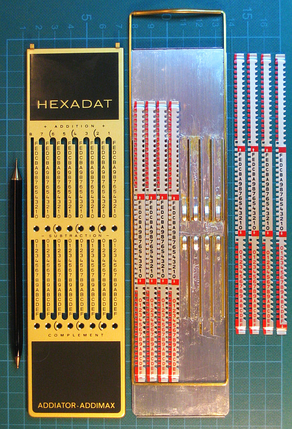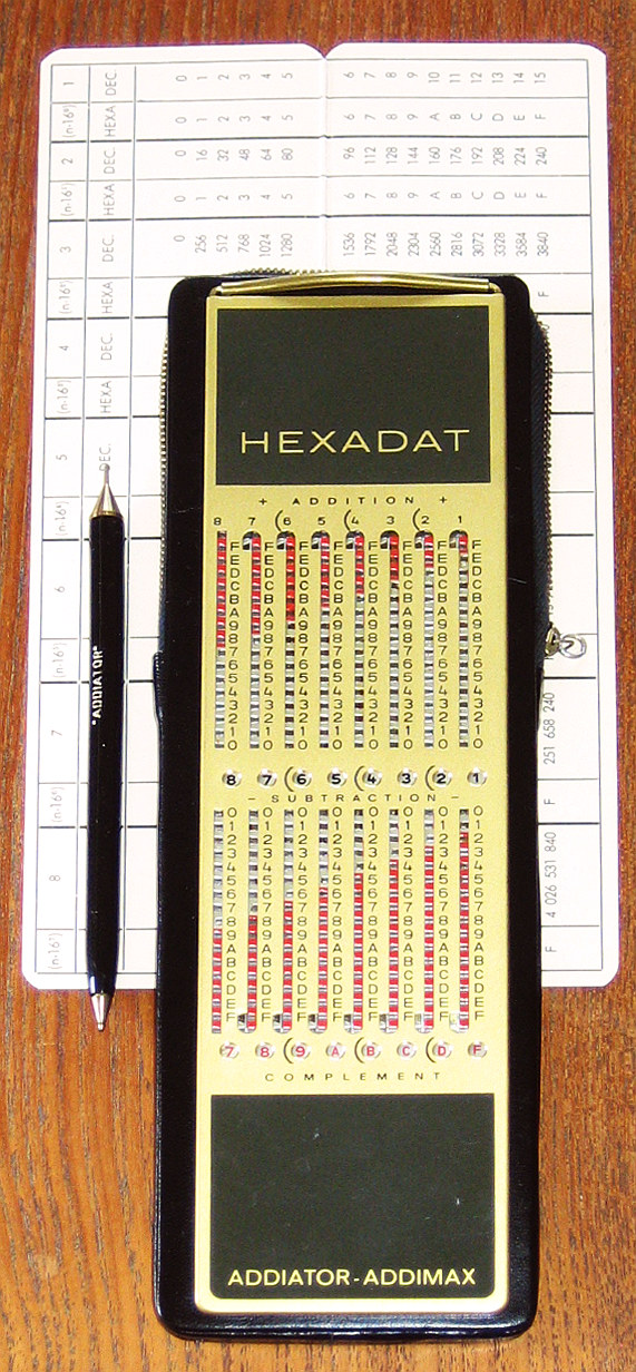 Serial-Number = 670409 ADDIATOR, Berlin / Germany (1967) B o d y S i z e ( W * D * H ) = 60 mm * 232 mm * 4 mm ADDITION / SUBTRACTION; 2-COMPLEMENT; Overflow/Underflow = RED MARKS with ARROWS; On its back side is a CONVERSION TABLE Hexa-to-Decimal The »HEXADAT« came with LEATHER CASE & STYLUS (w.pen) inside, incl. HEX-CONVERSION-TABLE & INSTRUCTION all in a cardboard box. Have a look at a HEXADAT ADVERTISEMENT & INSTRUCTION ( in German ) R E M A R K S T O R E S T O R A T I O N : ======================================================= The »HEXADAT« had to be opened because B L O C K E D R E S E T ...... Sharp edges had to be filed, harden fat spots removed, VASELINE applied: OBSERVE THE DIFFERENT SLIDER (= "2-COMPLEMENT") IN THE RIGHT POSITION ... ... SEE: How to convert DECIMAL-to-DUAL-to-HEXA / 2-COMPLEMENT ... impressum: ******************************************************************* © C.HAMANN http://public.beuth-hochschule.de/~hamann 07/09/16