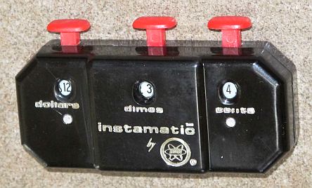 C O U N T E R S are specialized +1 ( or -1 ) Adding Machines ******************************************** ( 1 ) This is a MANUAL EVENT COUNTER ( eg. for statistics ) ![]() Held in the left hand ( middle finger slipped through the ring ) the top counting key is pressed by thumb. ( The right hand is free for making notes on paper. ) Turning the right wheel clockwise reset the counter. ( Manufacturer unknown ) ( 2 ) This RESETABLE ASSEMBLY-LINE COUNTER is activated by lifting its lever. It can be reset by turning the left wheel counter clockwise Manufacturer: VEEDER-ROOT, Hartford, Connecticut / USA ![]() ( 3 ) This is an electro-mechanical TELEPHONE TOLL COUNTER ( > 6 VDC, 50 mA, 25 Imp/s ) Manufacturer SIEMENS & HALSKE, Berlin / Germany ![]() ( 4 ) This electro-mechanical RESETABLE COUNTER was used to count lottery tickets in a sorting machine ( 24 VDC, 10 mA, 25 Imp/s ) Manufacturer: Fritz Kuebler, Schwenningen / Germany ![]() See an APPLICATION » PULSAR + COUNTER = DIGITAL TIMER « ( 5 ) This is a "Shopping COUNTER / Calculator", named »INSTAMATIC«: Inputs are DOLLARS (= 0..19); DIMES (= 0..9); CENTS (= 0..9) Made by FEDTRO, Hongkong ![]() ( 6 ) More Mechanical COUNTERS can be seen in the NCR Cash Register ... ( 7 ) A BATES STAMP NUMBERING MACHINE ... |