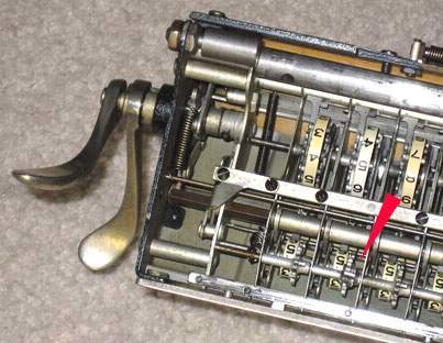 In addition to usual problems like rust, dents, cracks, broken or missing springs, clogged and bent levers, etc., the restoration of this »MODEL-1« was especially hard: Some tooth-wheels of the gear-unit in the body between coding and arithmetic unit (in the carrier) had broken teeth...
