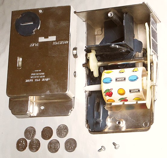 This TOY SLOT MACHINE BANK has a die-cast metal housing. When a 10 cent coin