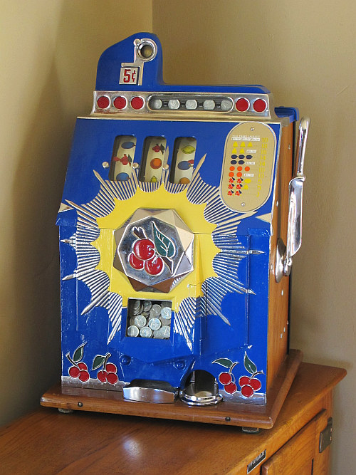 This MILLS »CHERRY BELL« is slightly different from the model in the book - but "THANKS!" to the good explanations and pictures: All problems could be fixed: (1st) MISSING SPRING on "Reserve JackPot Plate", (2nd) BENT "Reserve JackPot Deflection Plate", (3rd) WRONG MOUNTED COUNTER-LEVER for the "Main JackPot Deflection Plate", (4th) Cleaning & Oiling ... Now it works - WOW! --------------------------------------------------------------------------- In Dec. 2020 new problems had to be solved ... PostScript H I S T O R I C A L R E M A R K S : *************************************************************************** based on the book of M.Fey » Slot Machines « ( 5th ed. 1997 ) MILLS COIN MACHINES started with Mortimer Birdsul Mills' 1891 patent of a coin operated cigar vender. The PAU-PAU, the KLONDYKE and the OWL followed and in 1897 his son Herbert S. Mills took over his father's business. The MILLS NOVELTY grew rapidly selling slot machines worldwide - remaining the largest manufacturer for six decades. After the death of H.S.Mills in 1929 his four sons Fred, Hayden, Herb Jr. & Ralph took over the company. The HISTORY of the ups-and-downs of the slot machines market is well described with lots of pictures in FEY's book - A must to read !!! Have a look at the PACE SLOT MACHINE ... ... and see, that a "fair Slot Machine" has a PAY-OUT of ~80 % !!! Have a look at a PINBALL SLOT MACHINE ... Have a look at SLOT MACHINE SAVING BANKS ... A funny Scrabble: SLOTMACHINES ===>> CASH_LOST_IN_ME impressum: *************************************************************************** © C.HAMANN http://public.BHT-Berlin.de/hamann 01/03/16 |